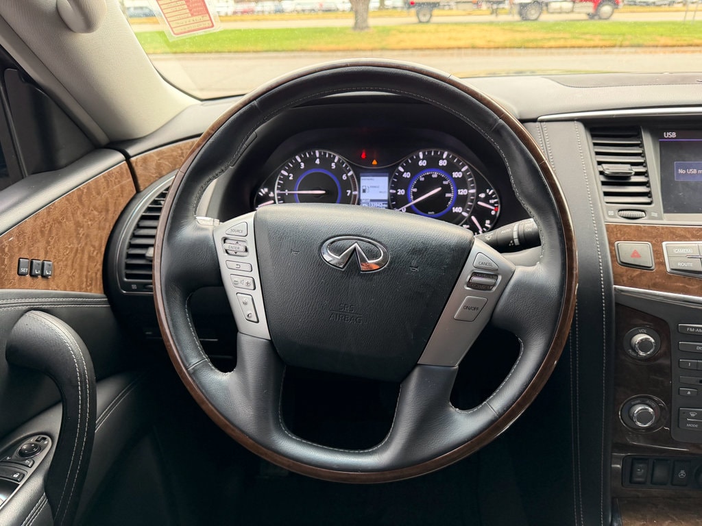 It comes equipped with all the standard amenities for your driving enjoyment. INFINITI prioritized practicality, efficiency, and style by including: delay-off headlights, power moon roof, and a split folding rear seat. A 5.6 liter V-8 engine pairs with a sophisticated 7 speed automatic transmission, and load leveling rear suspension maintains a comfortable ride.
